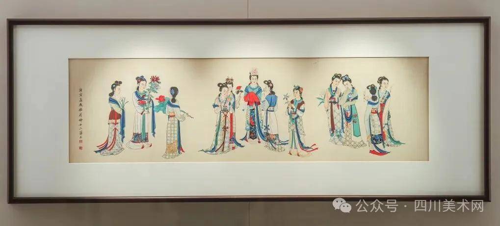 从艺术脉络来看,展览清晰呈现了赵蕴玉“诸艺兼通、学养深厚”的创作特质。在人物画领域,1963年创作的《蜀宫乐伎图》堪称其工笔艺术的巅峰之作,该作耗时十年打磨,以细腻笔触还原蜀地乐伎的婉丽姿态,线条流畅劲挺,设色清雅雅致,既延续了传统仕女画的审美意趣,又融入现代绘画的造型理念;花鸟画板块中,1978年的《四季花鸟屏》(春、夏、秋、冬四幅)与1992年的《荷花蝴蝶》最为瞩目,前者以“工写兼备”之法展现四季花木的生机流转,后者则以简远笔墨勾勒荷花的清雅之态,尽显“华彩熠熠、形神俱佳”的艺术追求;山水画部分,《金碧青绿山水》与《寒林秋思》形成鲜明对比,前者以浓丽色彩与遒劲笔骨塑造蜀中山水的润朗气象,后者则以淡宕墨色勾勒秋冬山林的灵秀意境,共同诠释了赵蕴玉对“蜀派山水”笔墨语言的创新探索;书法与诗词创作同样是本次展览的亮点,1976年的《存墨录》与1990年的自作诗《看花行》,字体含蓄秀丽,章法疏密有致,诗境与书艺相映生辉,充分展现了其“文人书画家”的深厚学养。